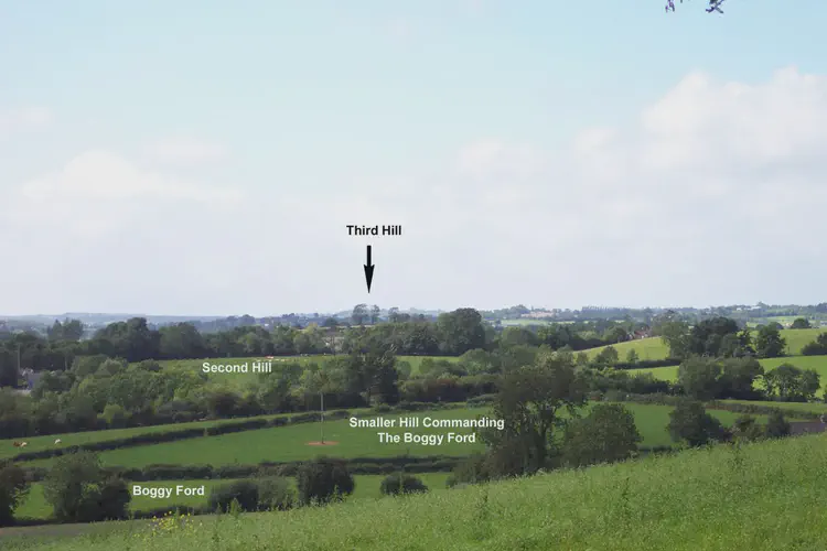 The country the English troops had to march over was hilly and wooded and interspersed with bogs, making it ideal for an ambush. ONeill had also lined their line of march with obstacles such as trenches and breastworks across the road. As soon as they left Armagh, the English were harassed with musket fire and thrown spears from Irish forces concealed in the woods. As a result the different English companies became separated from one another as they paused to deal with the hit and run attacks. This was accentuated when one of their artillery pieces became stuck in the mud and part of the column got left behind trying to shift it. Bagenal was killed by a shot through the head, further demoralising his troops and to add: to the chaos, the English gun-powder store exploded, apparently ignited by the fuse of a matchlock musket. Seeing their enemy in confusion, the Irish horsemen rushed the head of the column, followed by swordsmen on foot. The English troops in this part of the field (at the yellow ford from which the battle gets its name) were cut to pieces. The remnants of the English force managed to fight their way back to Armagh.